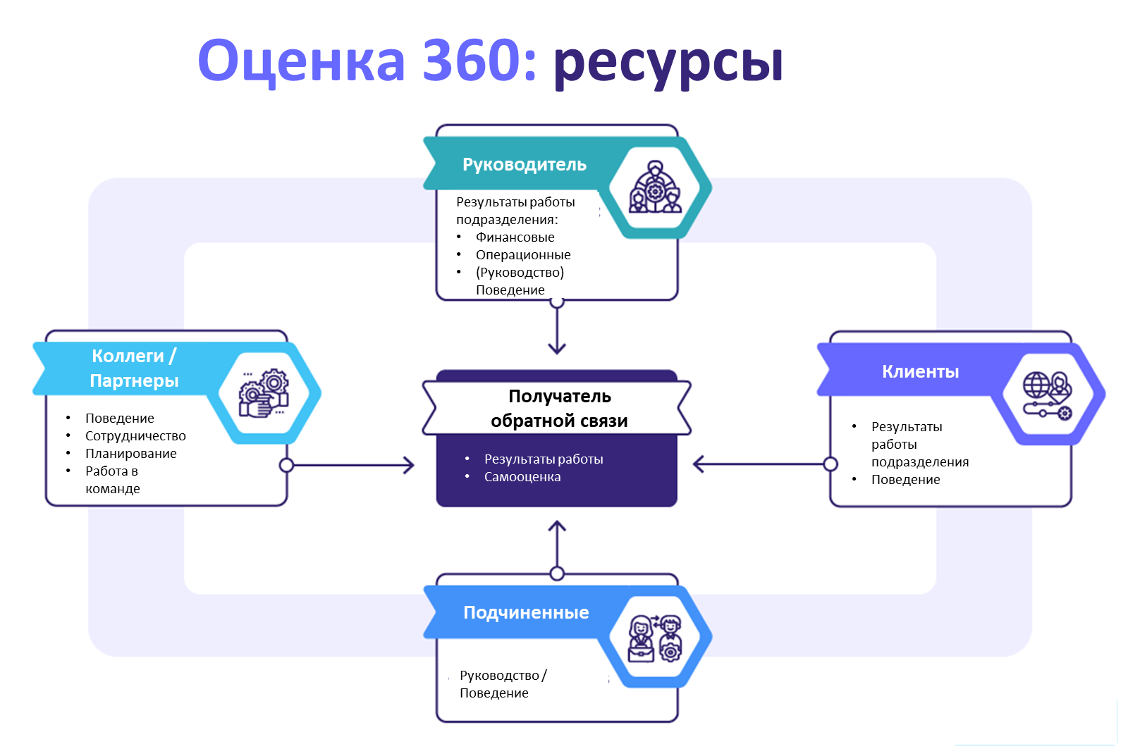 Метод оценки 360 градусов — это комплексный инструмент сбора обратной связи о сотруднике от всех ключевых участников его рабочего процесса: руководителей, коллег, подчиненных и даже внешних клиентов.